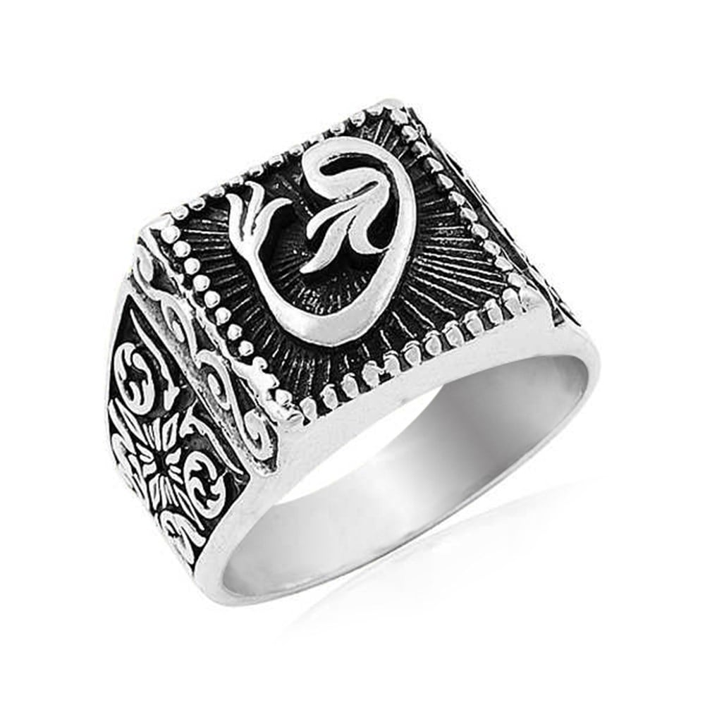 Kare Kesim Vav Harfi Desenli Gümüş Erkek Yüzük