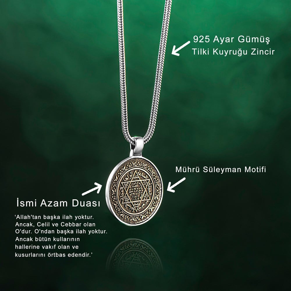 Süleyman Mührü kolye üzerindeki Rahmani sembolde Allah'ın dışında meleklerin ve bazı insanların bildiği İsm-i Azam duası yer almaktadır. Süleyman Mührü kolye öyle Rahmani ve tılsımlı bir kolyedir ki sadece sayılı kişi ve meleklerin bildiği Allah'ın saklı ismini (İsm-i Azam duası) içerisinde barındırır.
