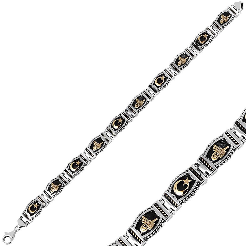Osmanlı Tuğra ve Ay Yıldız Motifli Gümüş Erkek Bileklik (DBL0008)