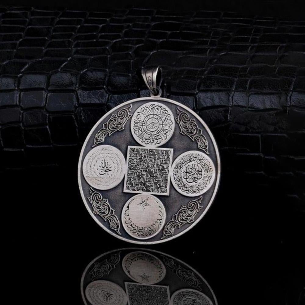 Kufi sanatının zarif çizgileriyle işlenmiş bu özel madalyon gümüş kolye ucu, derin manevi anlamlarıyla öne çıkıyor. Üzerinde Ayetel Kürsi, Fatiha Suresi, İhlas Suresi, El-Hakkani Mührü ve Kelime-i Tevhid yer almaktadır. Şık tasarımıyla günlük kullanımda ruhunuza anlam katar, aynı zamanda sevdiklerinize manevi değeri yüksek bir hediye olarak sunulabilir. Diriliş Takı özel hediye kutusu ve gümüş parlatma bezi ile gönderilmektedir.