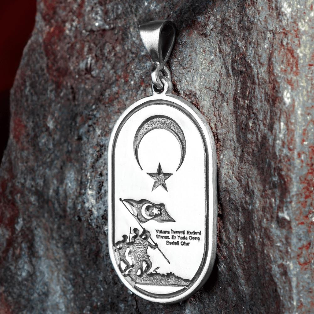 “Vatana İhanetin Nedeni Olmaz. Er Ya da Geç Bedeli Olur.” sözüyle tasarlanan bu anlamlı gümüş kolye ucu, vatan sevgisini ve sadakati simgeler. 925 ayar gümüşten el işçiliğiyle üretilen bu özel tasarım, hem derin bir mesaj taşır hem de güçlü bir duruş sergiler. Şık görünümüyle her tarzla uyum sağlar, vatanına bağlılığını yüreğinde taşıyanlar için özel olarak hazırlanmıştır.